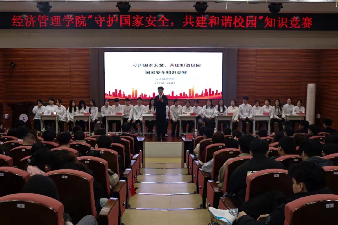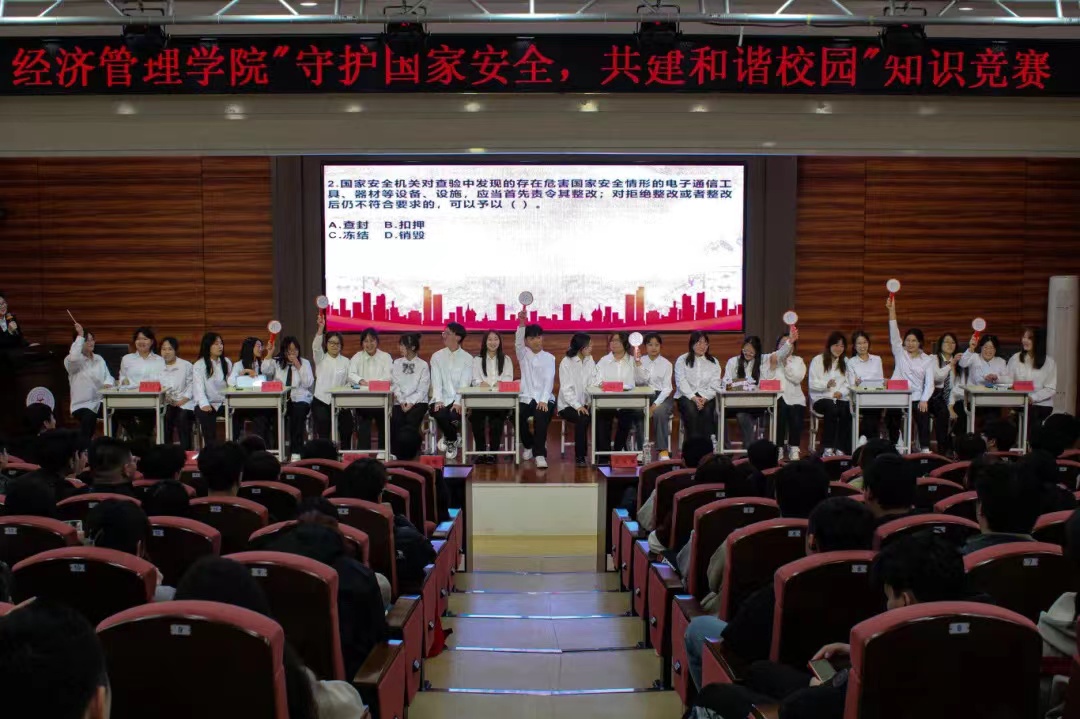 4月8日经济管理学院在图书馆报告厅举办“守护国家安全,共建和谐校园”国家安全知识竞赛。在比赛环节中选手们都准备充分,反应速度快,争先恐后地进行答题。通过此次国家安全知识竞赛,使得每一位师生都能够深入了解国家安全的重要性,掌握国家安全知识,共同守护国家安全。