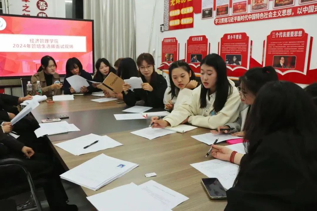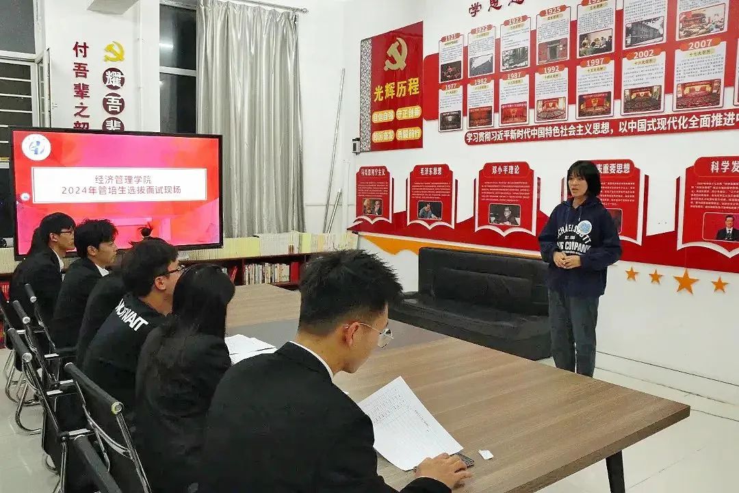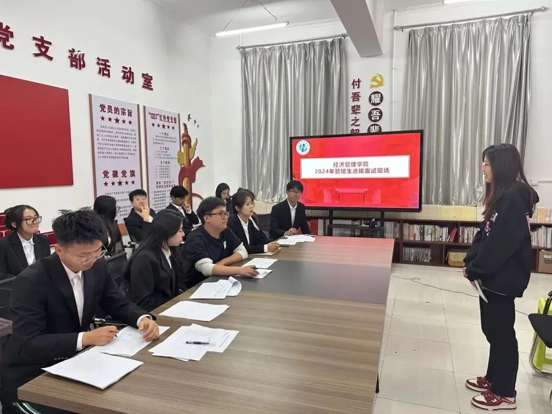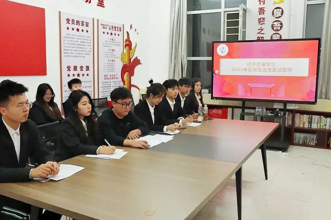 为进一步强化学院学团组织队伍结构,深化学生骨干的服务意识和奉献精神,经济管理学院于9月26-27日在第一教学楼113开展2024年管培生选拔面试,学院学团组织指导教师王宇晨、2024级辅导员李祎倓出席面试,六大学团组织负责人担任面试评委。