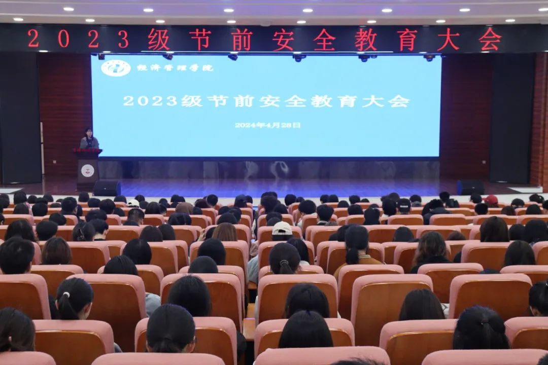 为贯彻落实学校关于五一假期期间的相关通知要求,加强学院学生假期安全教育和管理工作。经济管理学院于2024年4月28日在二教报告厅召开节前安全教育大会。会议由经济管理学院各年级辅导员主持,全体学生参加会议。