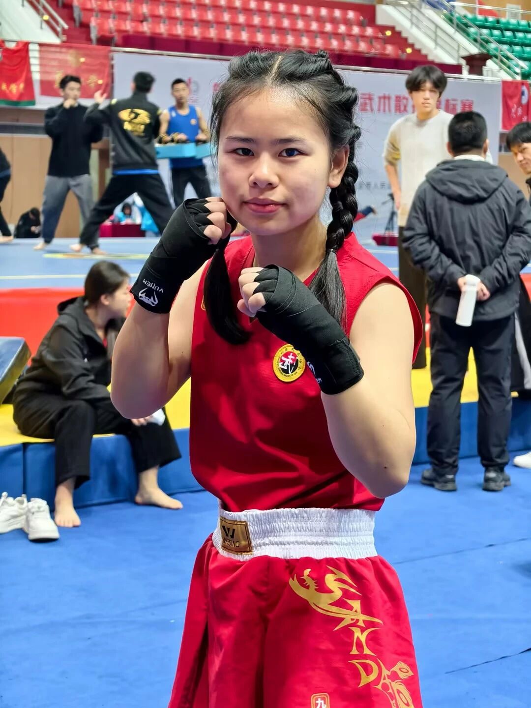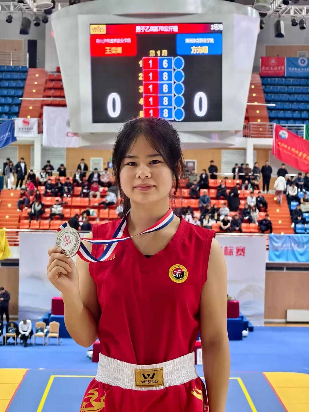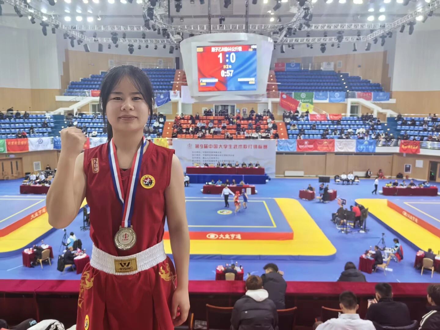 本次赛事由中国学生体育联合会主办,设置男、女子多个组别及54个级别竞赛项目,高手云集、竞争激烈。开幕仪式上,亚洲武术联合会副主席张金发等多位领导出席,三个擂台同步开赛,赛场氛围热烈非凡。赛场上,罗敏同学精神抖擞、斗志昂扬,直拳精准有力,鞭腿迅猛凌厉,攻防转换间尽显专业素养,闪避腾挪中暗藏战术智慧。每一次拳脚交锋都凝聚着平日的刻苦训练,每一场对决拼搏都展现着青春的热血担当,她用汗水诠释体育精神,用实力赢得赛场喝彩。