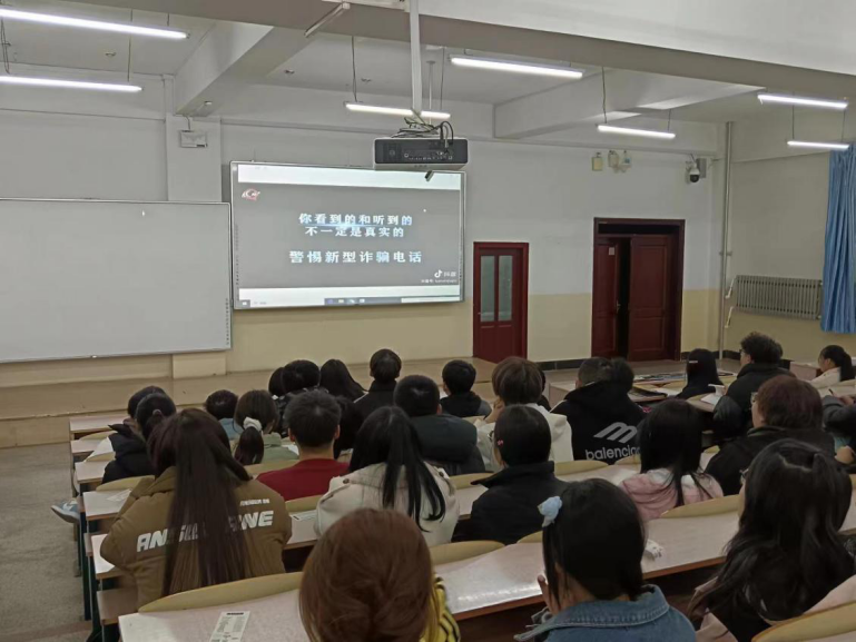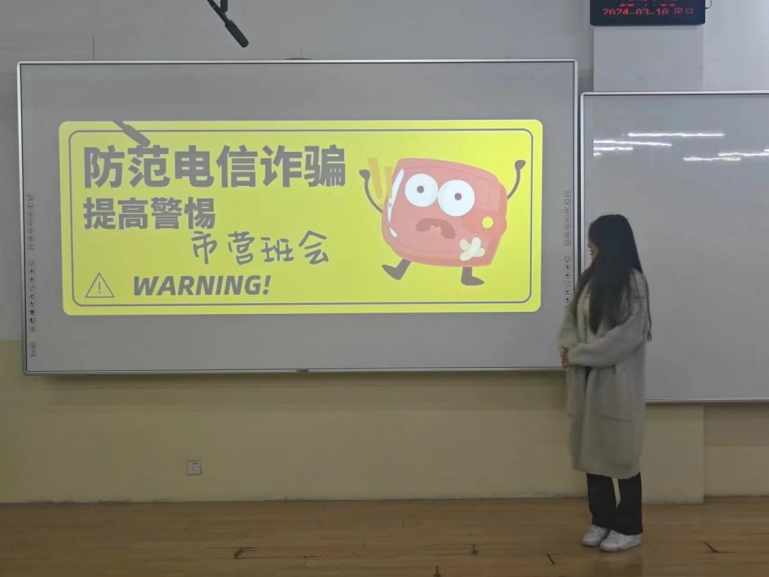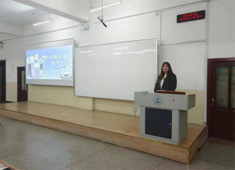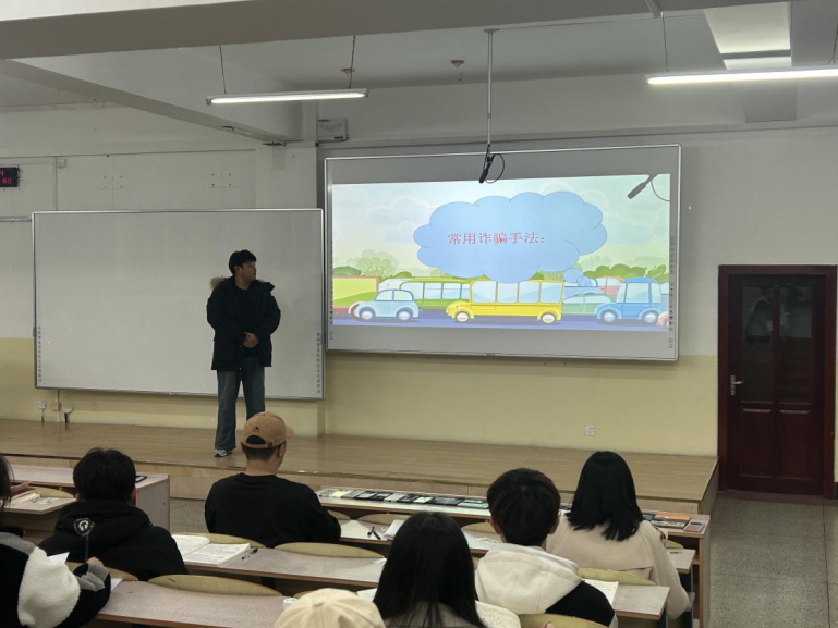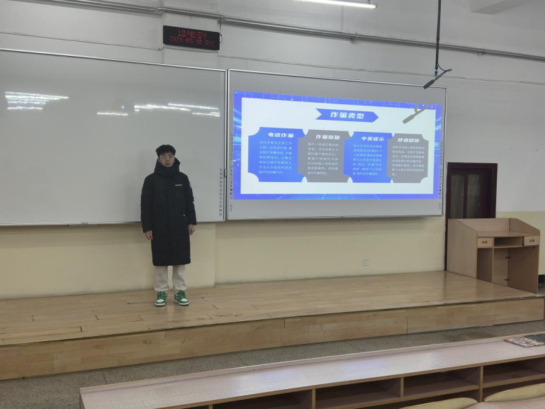 活动伊始,班级主讲人上台向大家介绍了常见的诈骗手段,并举出相关案例,帮助同学们提高自我保护意识,增强自我防范意识。