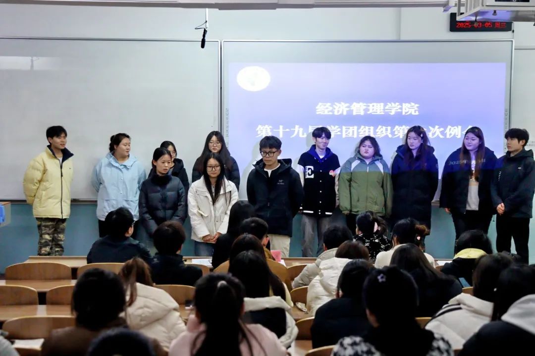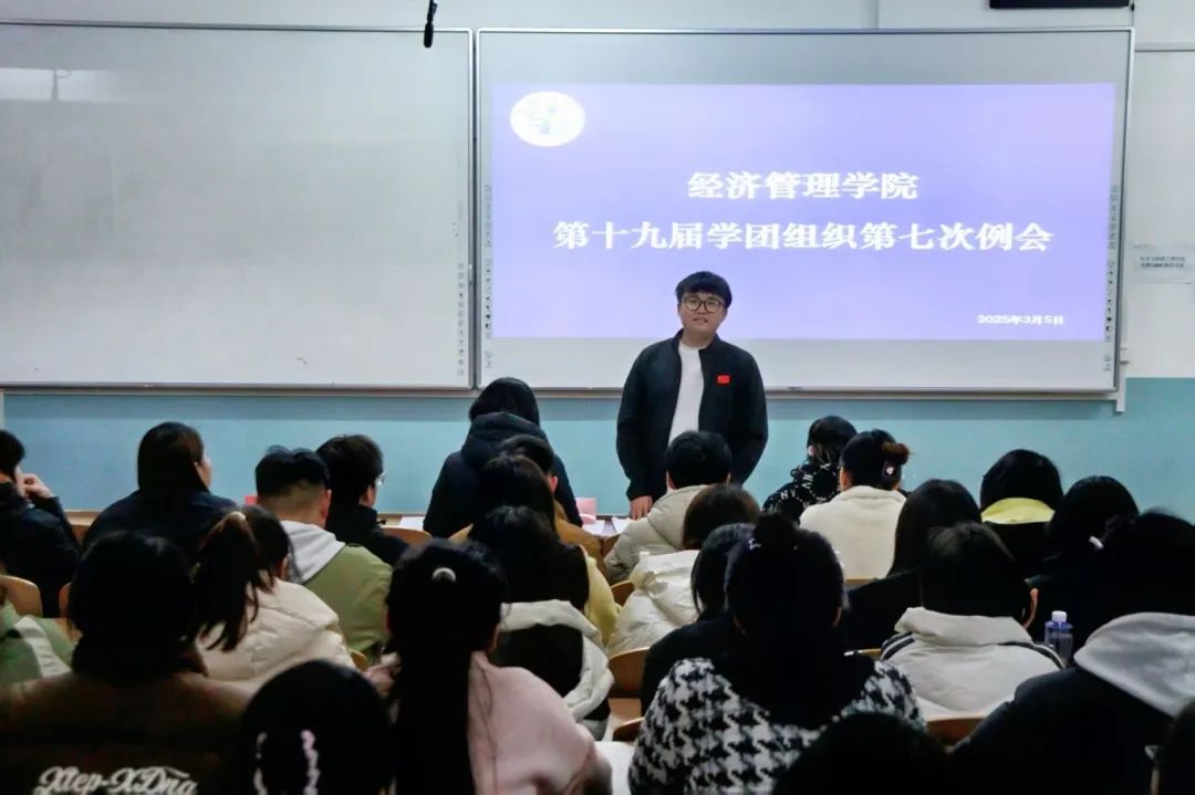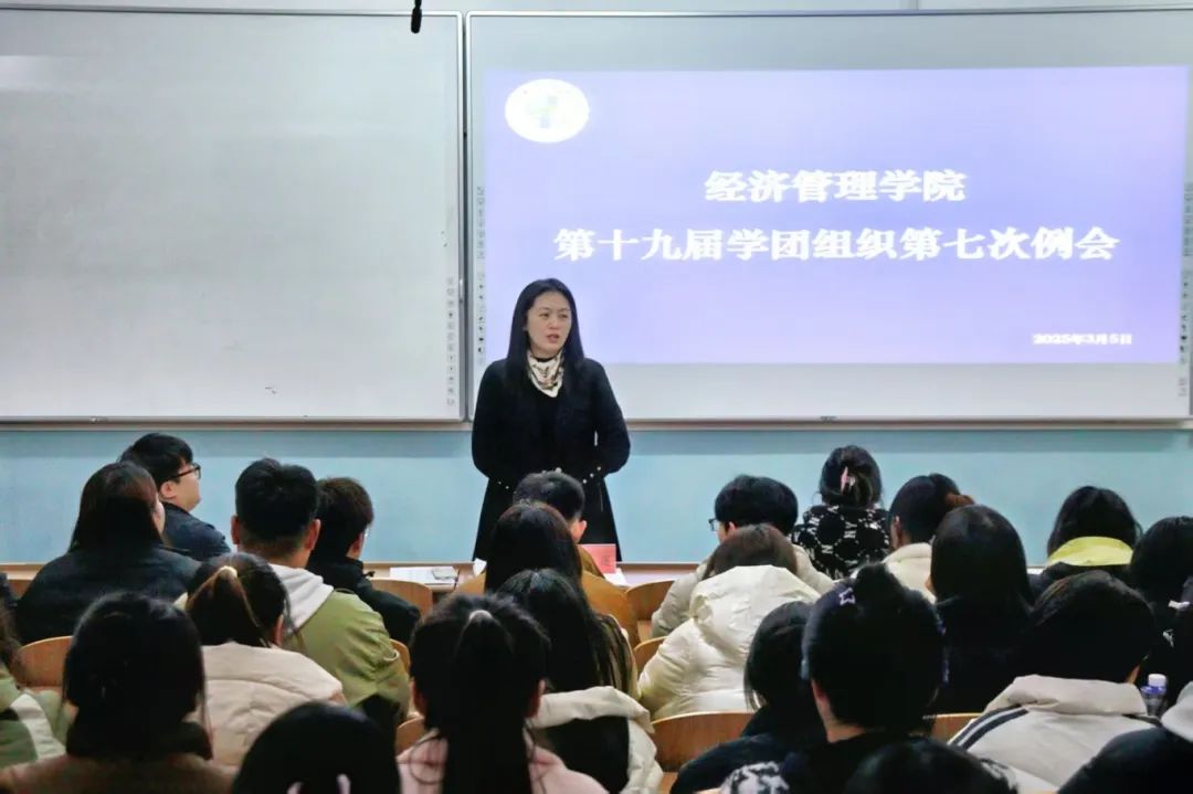 为确定新学期各项工作的锚定方向、全方位提升学生的专业素养、实践能力与综合技能。经济管理学院于2025年3月5日在一教110教室召开经济管理学院第十九届学团组织第七次工作例会。本次会议由学院团委书记王宇晨主持,学院党委副书记周桂莲、22级专升本辅导员宋文茜出席,第十九届学团组织全体成员以及24级管培生参加会议。
